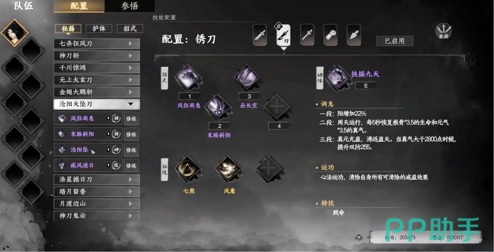 沧阳天坠刀是以盾盾流为核心的防守型刀法,适合偏好防守和生存的玩家。其一技能“风狂雨急”能够增加护盾层数上限,使得玩家在受到伤害时可以得到更高的防御保障;二技能“末路斜阳”能引爆护盾造成伤害,反击敌人。内功“沧阳坠”能够生成护盾并增强攻击力,同时降低敌人的防御。被动“疾风逐日”则是在护盾存在时,每次受到攻击都会触发AOE伤害。