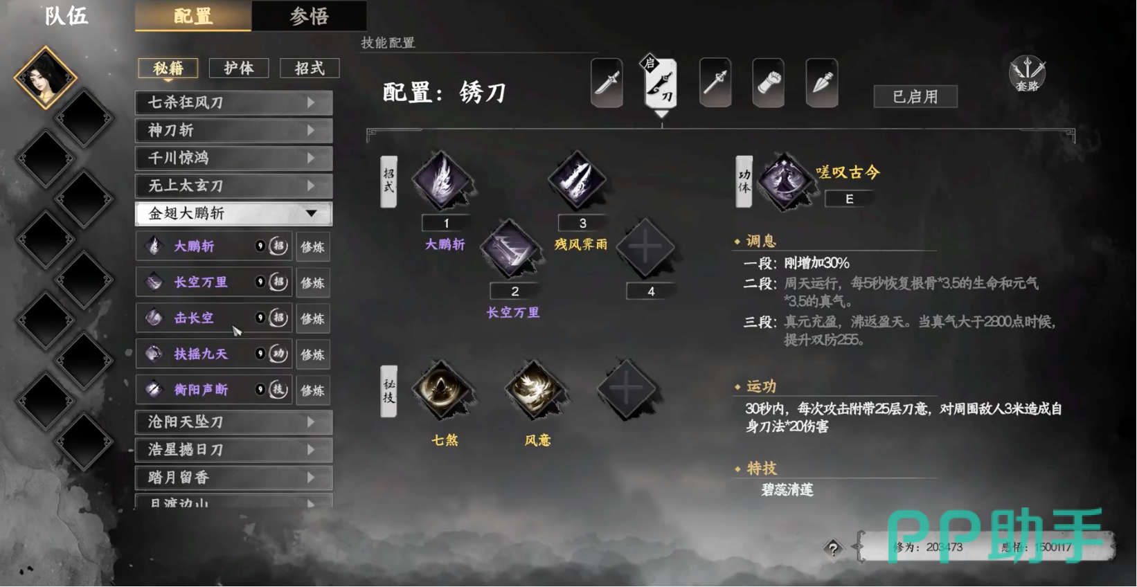 金翅大鹏斩是一把阳系刀法,专注于持续输出和控制。其一技能“大鹏斩”附带阳属性伤害和灼烧效果,能够长时间消耗敌人生命;二技能“长空万里”叠加减速并附带灼烧,使得敌人在战斗中很难逃脱;三技能“击长空”带有晕眩效果,能够有效限制敌人的行动。内功“扶摇九天”清除DEBUFF,并提供对带有DEBUFF的敌人30%的增伤,增强了对控制型敌人的打击力。被动“衡阳声断”能够自动生成陷阱,增加对敌人的控制和限制。