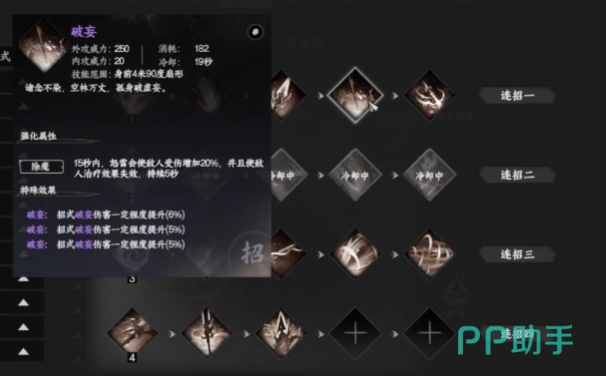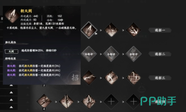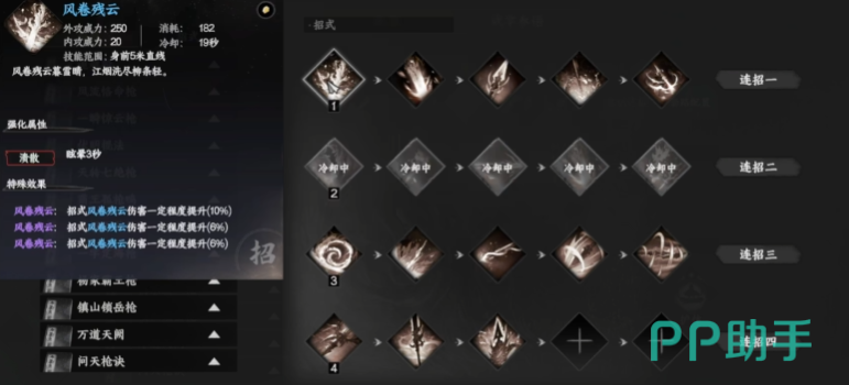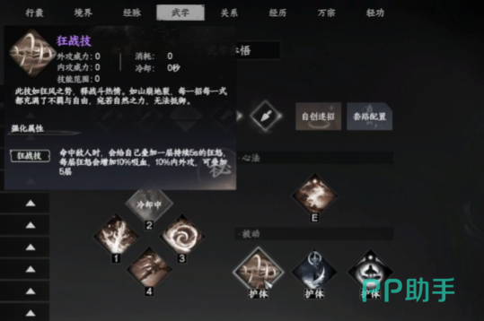 拳系连招分为阴系和刚系两种无限连打法,阴系无限连选用寒江一钓作为功体,招式组合为飘雪穿云、摧心劫与白骨化,其中摧心劫与白骨化具备较高的输出能力,护体技能选择必中、七伤劲以及从特定NPC处学习的增伤技能,刚系无限连则以龙象为功体,该功体在战斗过程中无需操作即可自主生效,招式搭配九天潮来、万物回照、力按千斤与雷鸣破月,主要依靠雷鸣破月的固定百分比扣血机制实现输出。