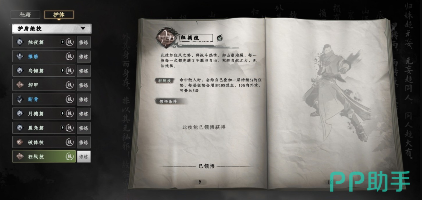 狂战技是属于游戏中的枪系武学技能,只有枪系才可以配置,具有强大的吸血效果,对于提升战斗续航有着很大的帮助。具体获取方式是需要大家先去普贤门,在普贤门找到npc玄妙接取任务。接取任务之后需要分别去寻找杨虞与李叹。来到淮陵之后,知晓两个npc因为两家的恩怨所以陷入矛盾,所以需要主角出面调停。