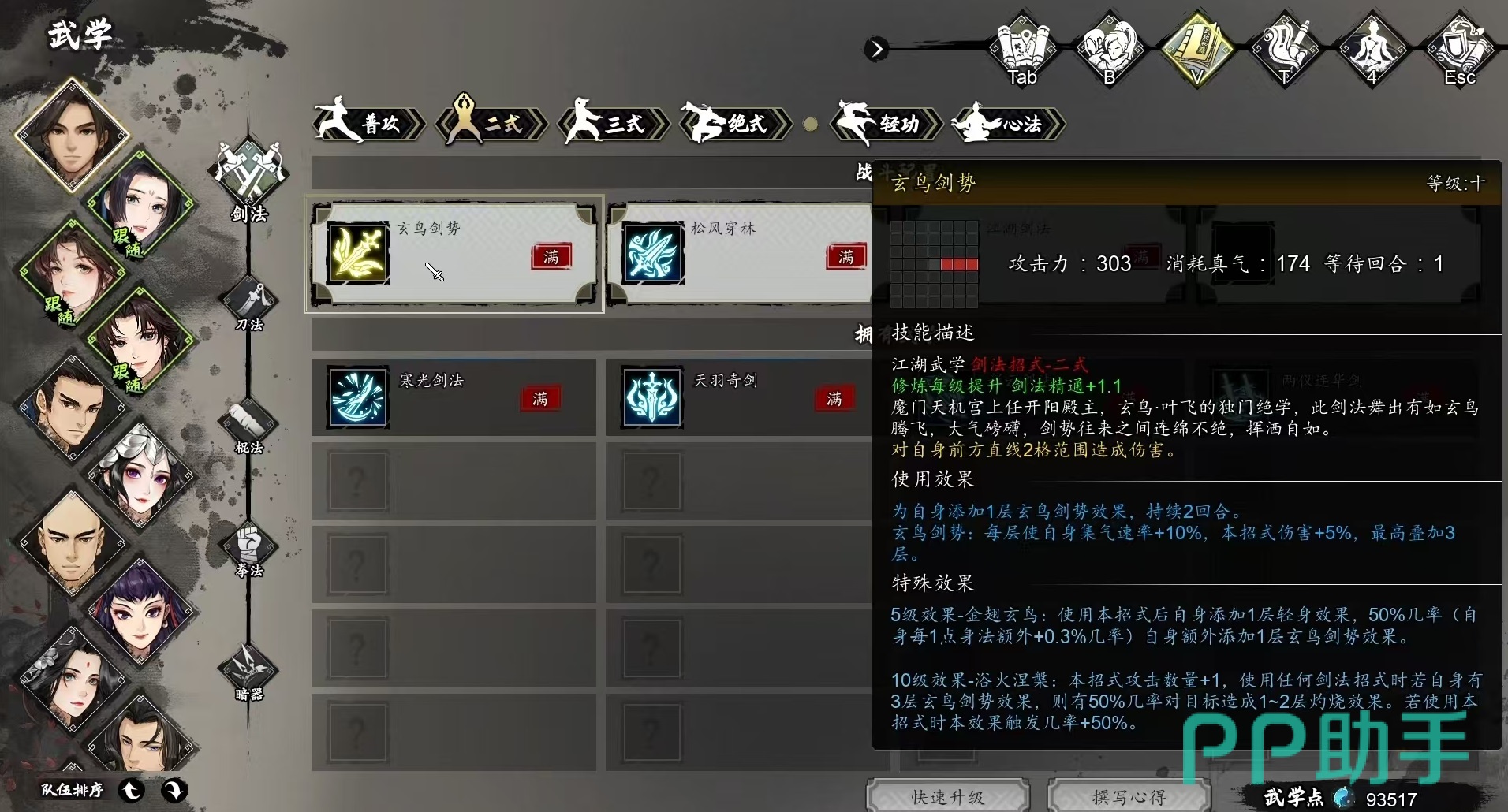 搞定了心法之后,接下来就是最重要的招式搭配。一式推荐选择烟霞剑,在霍长青处通过请教就能习得,作为比较少见的一式蓝技,在释放过程中有较大的几率施加两层刺目效果,降低敌方命中率,可提升角色生存能力。二式推荐选择玄鸟剑势,这是通过主线剧情就可以获得的二式金技,前期就可以入手伤害很高,释放时还有很大的几率施加两层集气效果并附带灼烧。三式推荐流云剑,也可以选择清风剑,在武当处请教获得。流云剑更侧重生存,可额外增加闪避,闪避还能触发回血,清风剑侧重攻击,有常驻闪避和攻击加成,伤害较高。