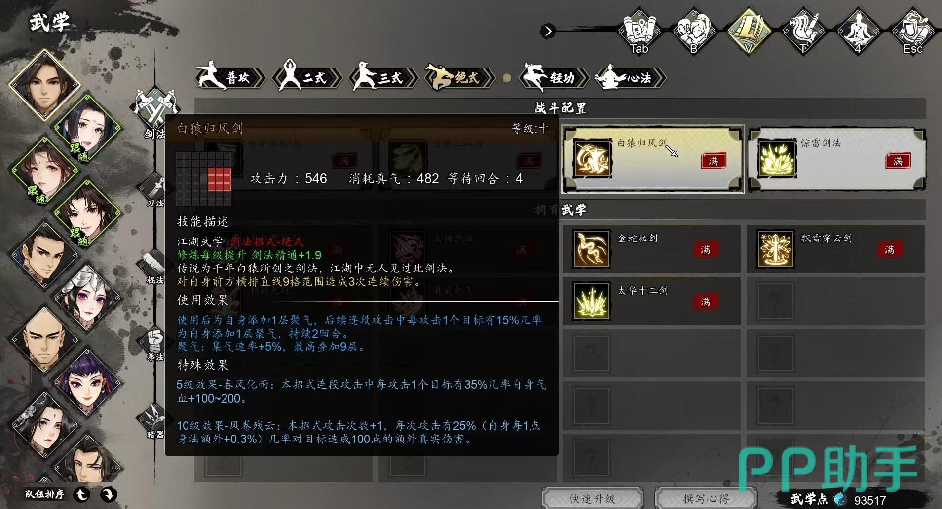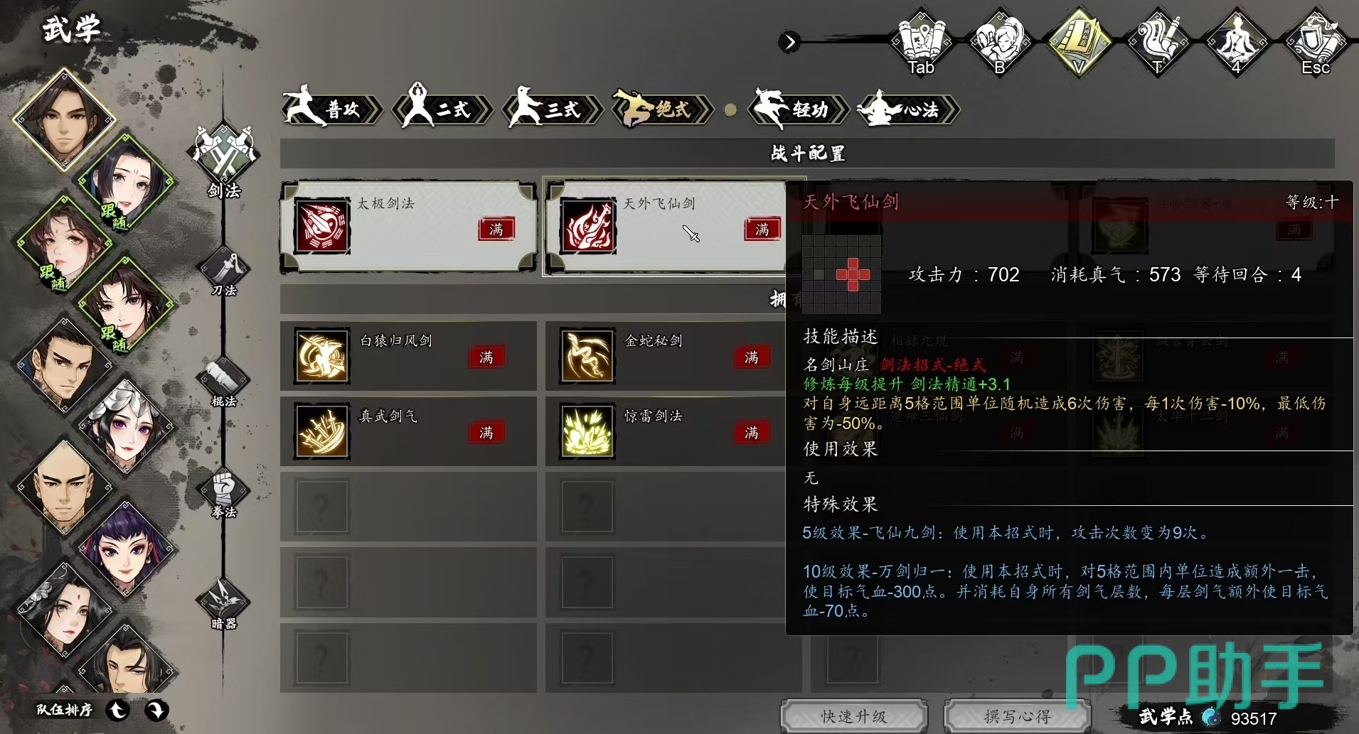 在最关键的绝式搭配方面,白猿归风和天外飞仙是比较不错的选项。在城隍庙里就可以获得白猿归风,达到10级时通过4连击可以打出高额伤害,攻击范围也比较大,群攻效果优秀,天外飞仙是在名剑山庄请教获取到的,号称游戏中的最强输出技能,九连击伤害极高。