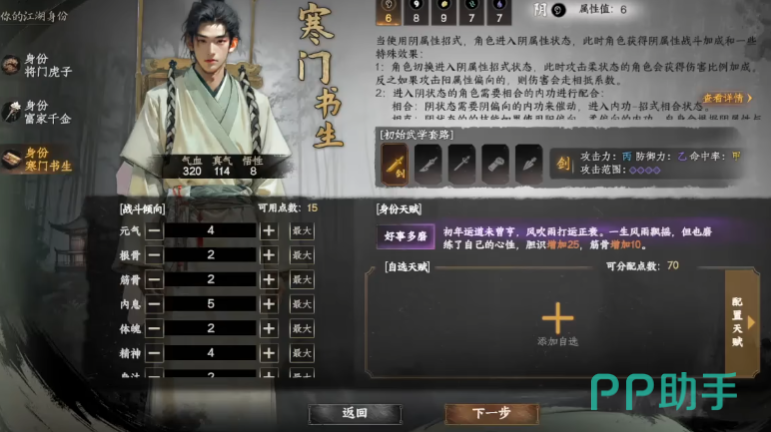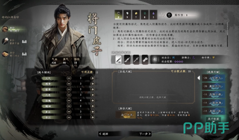 将门虎子这一身份,承载着深厚的家族荣耀与江湖使命,玩家扮演的角色身为名将之后,却因意外流落江湖。此身份初始配置倾向战斗,自带扎实的近战基础与武学感知,在战斗中展现出凌厉攻势与坚韧防御,剧情围绕家族渊源、江湖恩怨与家国责任展开,玩家将频繁参与江湖纷争,协助门派平定匪患,甚至卷入朝堂势力博弈,资源获取上凭借家族余荫与人脉,在完成侠义任务、参与大型江湖事件时,能获得丰厚金钱、修为及珍贵武学秘籍奖励。