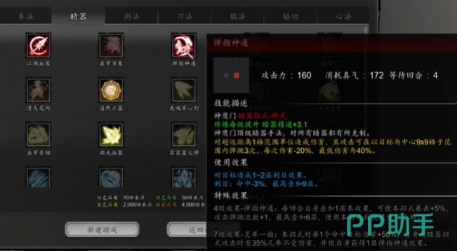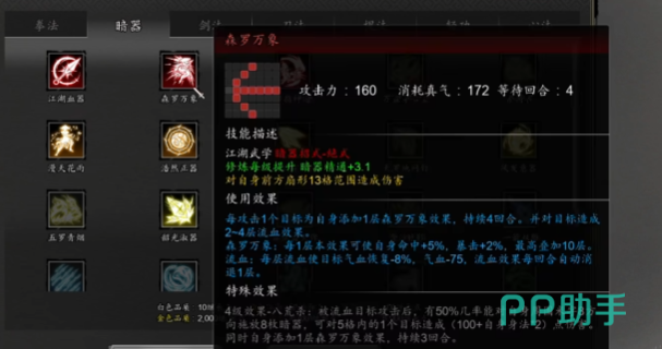 随着玩家深入江湖,高阶暗器招式逐渐解锁,战斗能力大幅提升,暴雨梨花针的攻击范围扩展至远距离五格,命中敌人后可降低其命中率并附加流血效果,无论是干扰单个强敌的攻击节奏,还是对群怪进行范围压制,都能发挥显著作用,金色品质的绝式武学含沙射影,可对前方直线五格内的目标发动攻击,并有概率触发自身范围伤害,在BOSS战等关键战斗中,能借助其爆发特性打破僵局。