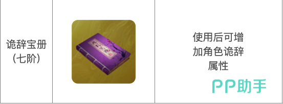 诡辞宝册,为最高阶,七阶的诡辞武学秘籍。玩家在使用后可直接增加16点诡辞,同样可通过野外宝箱或敌人掉落获得,仅限于后期高手玩家,获取难度最高。