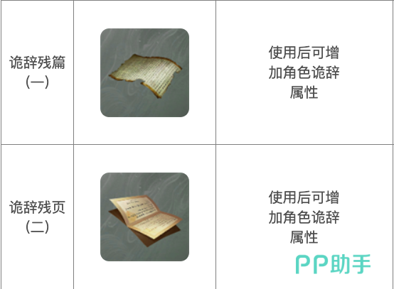 诡辞残页,在使用该道具后,能够使诡辞增加三个点数,其主要获得方式同诡辞残片一样,也要通过野外宝箱,或敌人掉落,或在书画商处购买,目前比较推荐的野外宝箱获取处是大漠之地,岭花谷,敌人的话一般是一些boss级的敌人会掉落比较多。