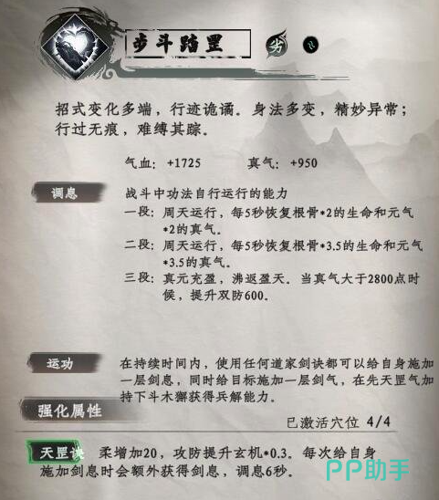 步斗踏罡:为功体,能够触发三段式伤害,第一段每秒能够回复2点气血和2点真气。在触发第二段伤害后,每5秒能够恢复3.5的根骨和3.5的真气。当触发第三段伤害时,如果玩家的真气值超过2800 10,则可提升600点的双防。