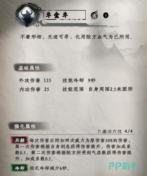 牛金牛:为招式之一,他可对周身为园区内的敌方单位进行强有力伤害,外攻伤害高达135,冷却时间长达15秒,目前可达到的原型直径为2.5米。在进行强化后,每次伤害都可附加两次威力!冷却时间则可减少6秒,在发动时会消耗感悟和领悟。