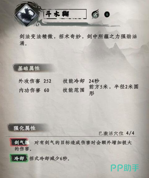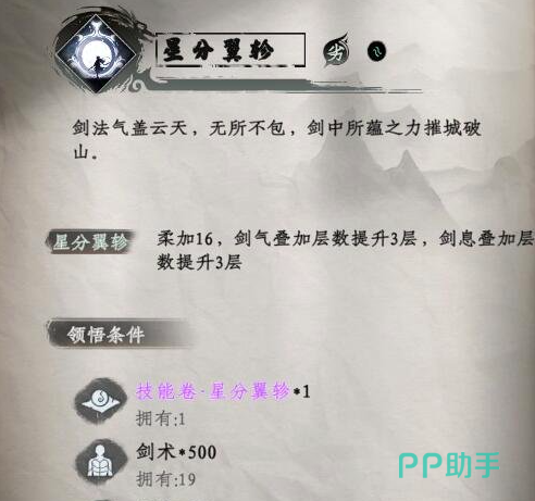 星分翼轸:此秘技,使用该技能可提升16点的柔属性,并且将剑息和间气叠加层数,分别提升到三层,不过需要玩家注意,它是有一定领悟条件的,获取技能卷星分翼轸,剑术必须要达到500,悟性要超过200。