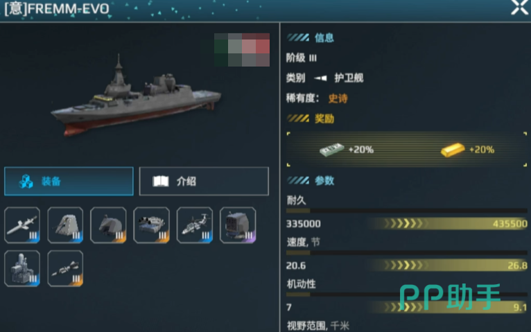 意大利三级护卫舰,转盘保底方式获取,几乎以压倒性的战术价值席卷了各大对局。搭载的两座自由主炮和四座锁定火箭炮,构成了极具侵略性的火力配置,在实战中几乎等同于两主炮三火箭的组合,火力强度堪比标准重巡级别。更为难得的是,她的机动性同样出色,加速迅猛、极速优秀、转弯性能优异,能迅速切入战场或转点规避火力。EVO在面对驱逐舰时尤其具有压制性优势,娇小船体配合高火力与灵活性,让其成为压制敌方轻型舰种的利器。此外,她在拉边和架点方面同样出色,可以在远程压制敌方推进,作为战术后方的输出支柱。然而需要注意的是,EVO虽然火力强大,但仍是一艘护卫舰,本身血量和抗压能力相对较弱,一旦与重甲巡洋或战列舰近距离正面对抗,往往会处于劣势。使用EVO的关键在于充分利用其机动与隐蔽优势,抢占输出位或扰乱敌方阵型,始终保持作战主动权。