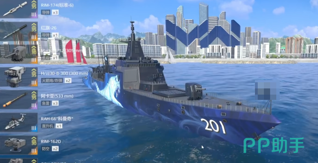因其强大的全能属性被誉为“泛用性最强驱逐”。在当前版本中,055A通过新增两枚鱼雷进一步完善了近战与反潜能力,达到了4导弹、2火箭、1主炮、3鱼雷的全面配置。不仅火力密集,布局也极其合理——所有主要武器集中在舰艏,便于玩家在掩体后方输出火力的同时减少暴露面积,强化了实战中的生存性。三枚鱼雷虽然在单发伤害上不如火箭和主炮,但在面对潜艇或近战缠斗中往往可以作为奇兵使用,补足了055A此前在贴脸战中存在的短板。同时,其所有导弹与鱼雷均为三联装设计,装备选择上给予玩家极高的自由度,对于那些只持有部分强力装备的玩家尤其友好。得益于良好的加速性能和紧凑武器布局,055A能够灵活应对各类作战环境,无论是山地卡位、野区穿插还是正面团战都有出色表现,几乎没有明显短板。