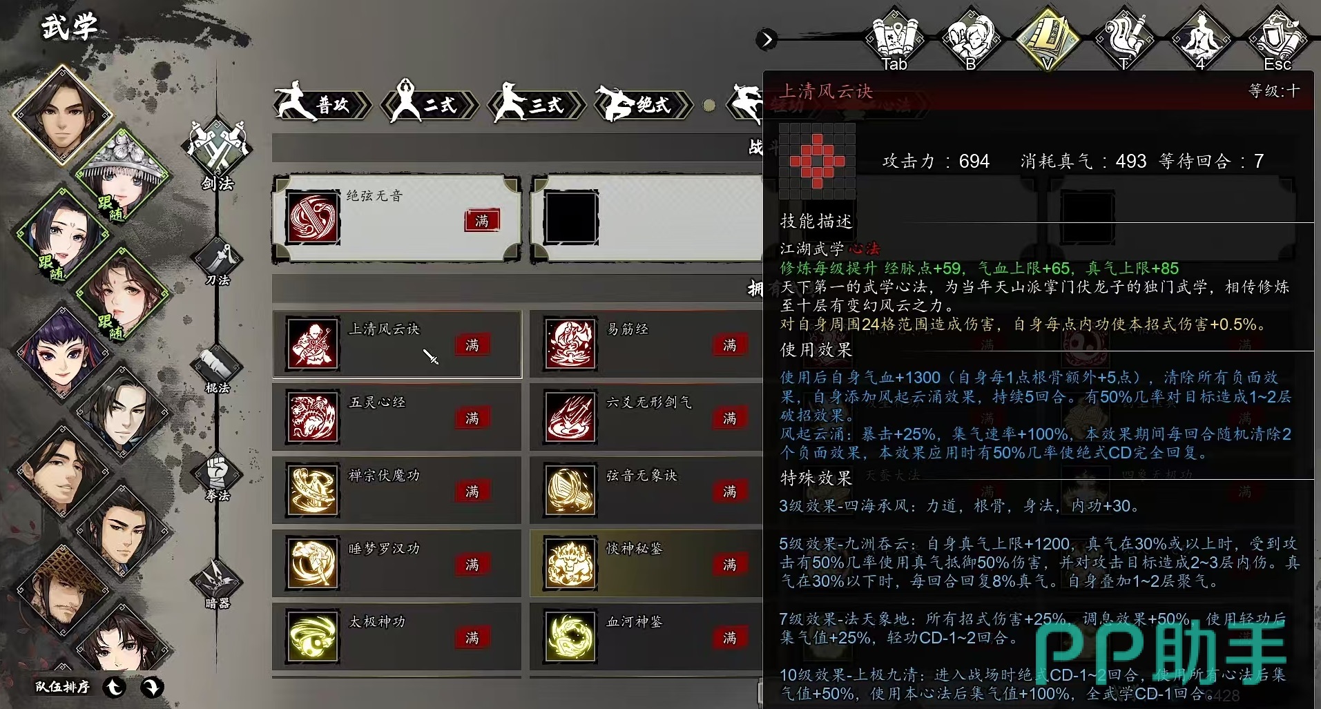 风起云涌是很好的buff加成,提升25%的暴击和100%的集气速率。在此效果持续期间,每回合还能随机清除两个负面效果。上清风云决升到3级时触发四海成风,使得自身的内功、身法、力道和跟骨都能提高30点。升到5级时触发效果九州吞云,大幅度提高自身真气上限,在真气达到30%或以上时,受到攻击时有几率使用真气来抵御伤害,并对攻击目标附加内伤。在真气处于30%以下时,每回合可恢复真气并叠加聚气。升到7级时触发效果法天象地,所有招式伤害增加,调息效果增加。10级触发上极九清,进入战斗时,使用所有心法后集气提升。
