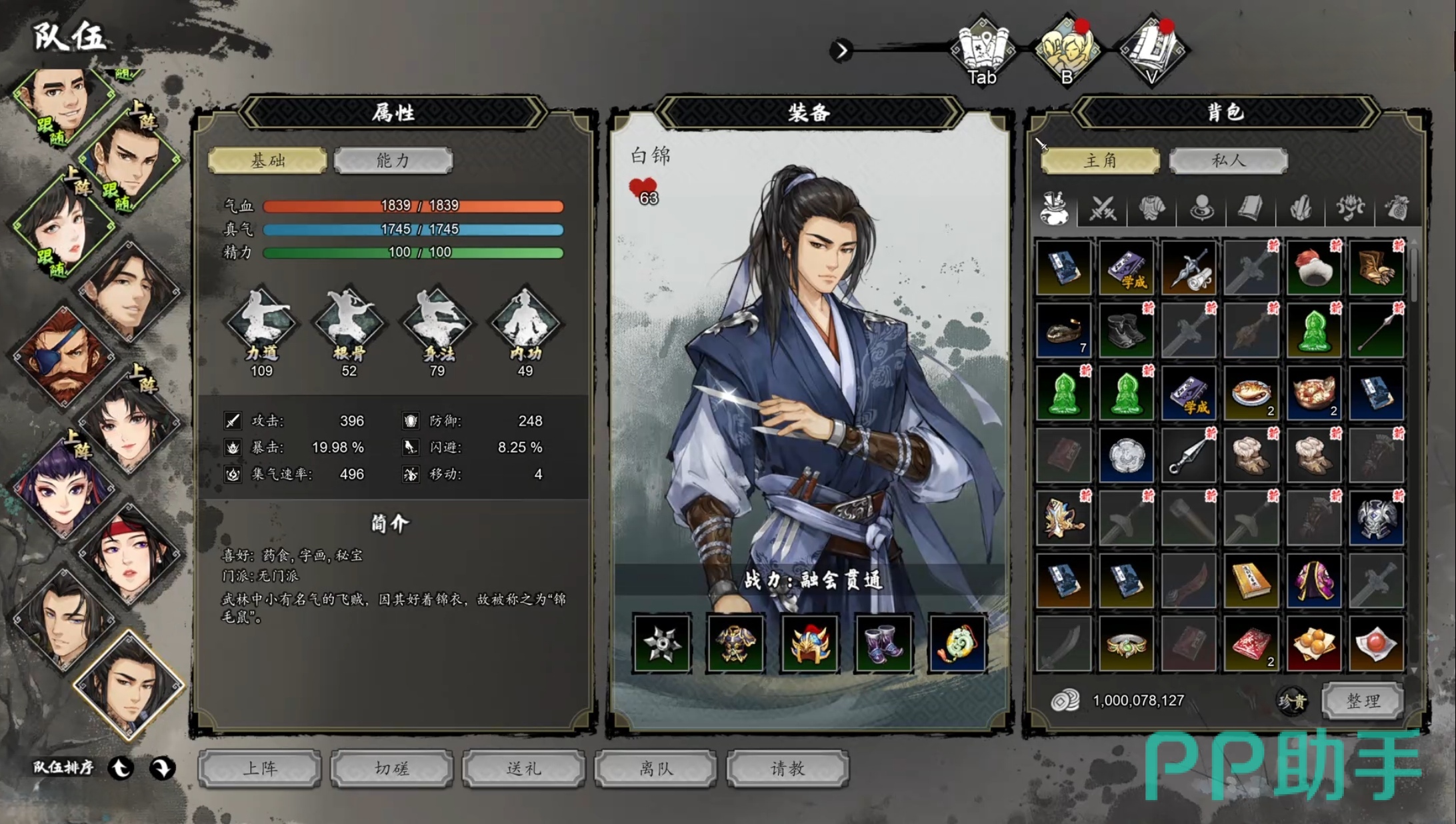 白锦原来是五毒教精英弟子,英教派内的战斗被迫逃亡了,他的性格冷漠寡言,但对于信任的人会显露出忠诚。白锦的装备优先选择毒伤加成、身法、暴击的,队友搭配要选择坦克宇文逸来吸应仇恨,还要选择的就是治疗宁楚楚来保障生存。武学搭配选择毒系内功和高连击暗器招式。白锦前期拥有高爆发,适合秒杀那些脆皮敌人;后期配合毒伤流派,持续削弱boss;弱点就是身板较脆,需要搭配上坦克和治疗保护一起。