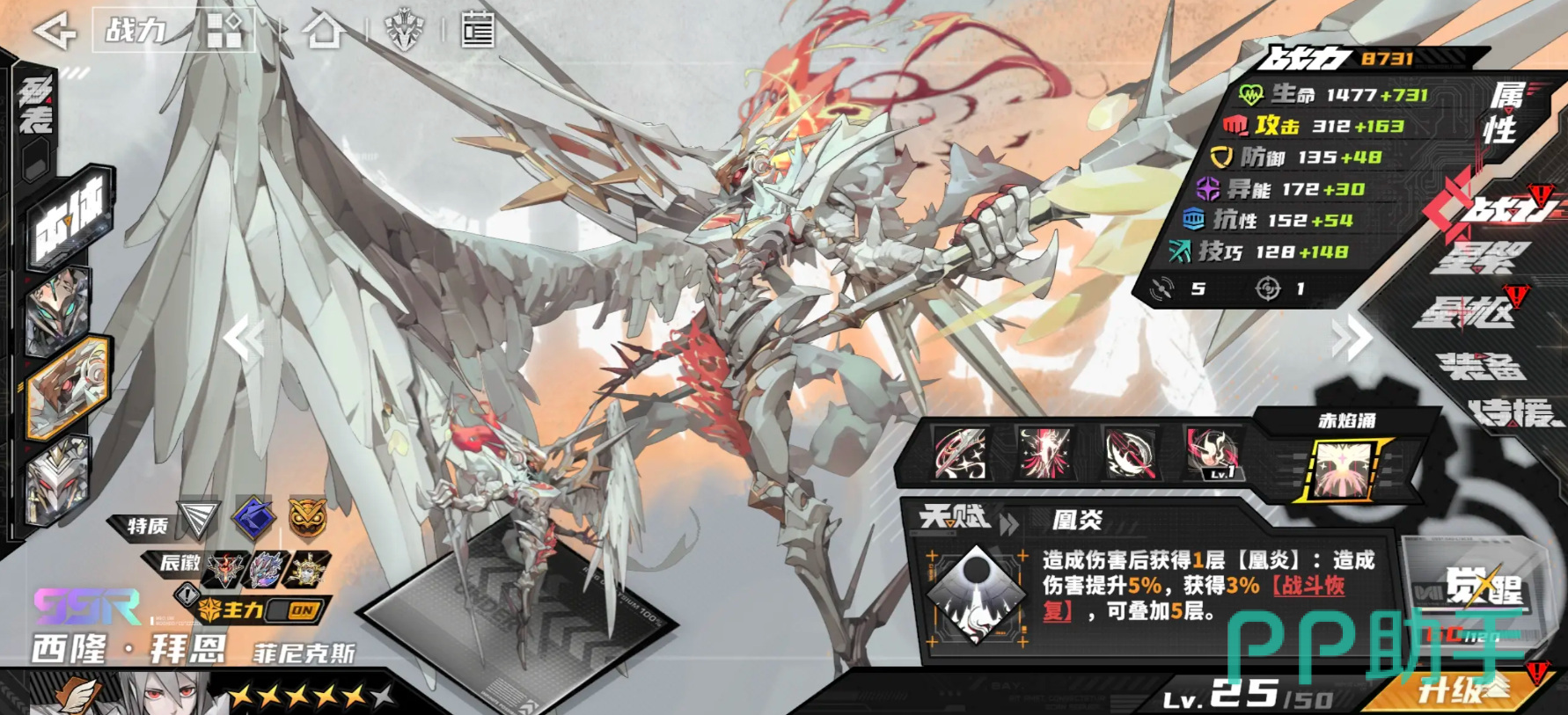 西隆的第二形态为菲尼克斯,是推图最好用的,共鸣技可以对一圈敌人附带伤“灼烧”的固定伤害,他的“火神枪”能对单个目标造成140%伤害,并在战斗后施加上灼烧,他的“焚天火雨”射程非常远,可大范围附加上灼烧,他的被动是非常强的免死保命技,能在受到致命伤害时,免除一次死亡并恢复15%生命,在抗压局有奇效。