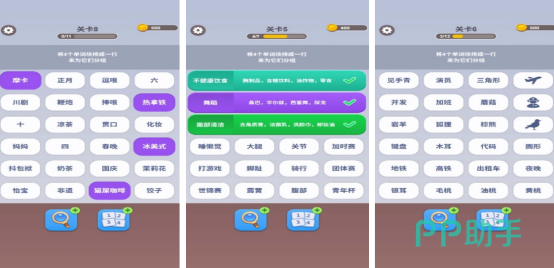 以各种汉字以及词汇组合在一起,玩家将会利用自己所学的知识面对各种脑洞大开的谜题,每一个关卡开始。之后所呈现出来的词汇都是特别凌乱的,而玩家要通过正确归类的方式,将所有的词语归到相同的类型当中,就能够完成闯关,只要4个相同类型的词语排成一行之后就会快速消除,会给玩家获得无尽的解压感,也能激发玩家的潜能,还能开阔视野。
