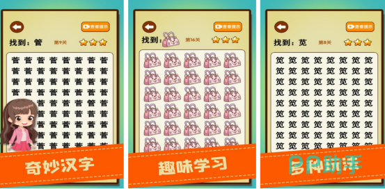 丰富多样化的关卡内容,每一个关卡中呈现出来的汉字都特别相似,如果没有仔细观察,很难发现出不同的地方,这款游戏就能够让更多的玩家对于我国文化有全新的认识,并且重新了解到汉字的奥妙之处,比较考验玩家的观察能力和眼力。您可以在闲暇之余利用这款游戏来对文字有全面的认知,每一个关卡中都会呈现出很多辅助道具,可帮助玩家顺利闯关。