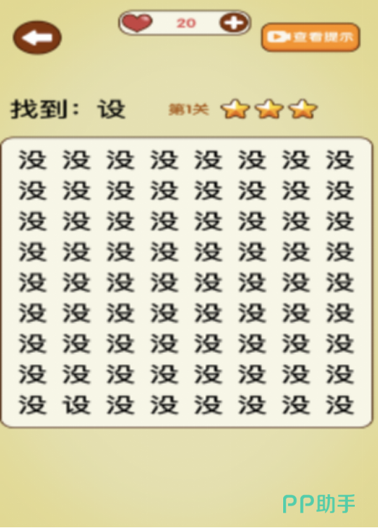 简单易上手的操作方式,可以让更多的玩家更加深入地了解我国的汉字文化,在每个关卡开始之后,都会呈现出很多极为相似的汉字,但是每一个关卡中都会呈现出不同的字。玩家要通过仔细观察的方式寻找到与众不同的那个字眼。然而每一个关卡中都会有三次机会,可能刚开始闯关时挑战。难度特别简单,但是随着关卡的升级之后,难度也会越来越高,您快快加入吧。