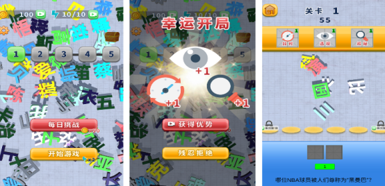 将找茬以及文字的元素结合在一起,在每个关卡开始之后都会呈现出各种堆叠的汉字,而每一个关卡中所提供的要求是完全不同的,您需要按照具体的要求在错综复杂的汉字当中寻找到规定的文字,每个关卡中也会有提示。以及加时的道具,如果遇到难以突破的难关时,就可以巧妙使用这些道具了。