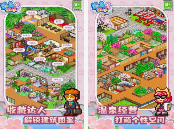 经营着温泉旅馆为主要玩法的此手游,通过不断建设店铺,以及客房的方式,使更多的客人,都能享受泡温泉的欢乐。打造了专属的温泉乡以后,也能成为附近备受关注的。以现实生活中的温泉旅馆,所具备的特色服务进行设计,涵盖寿司店以及浴缸等特色的内容,和建筑设施,每一个客人在进入了游戏的世界当中以后,都能享受超多的服务。