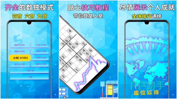 数独是一款风靡多年数字游戏,《全民数独》内为大家提供着从入门的4、6宫格到经典的9宫格多种模式,纵使是新手玩家,也能在此根据专业教学模式迅速上手。游戏玩法涉及丰富的逻辑推理考验,以九宫格为例,在纵横交错的9乘9大宫格内,还分为9个3乘3小宫格,大家需要在其中填入1到9的数字,促使横9竖9以及独立的3乘3格内数字不重复。