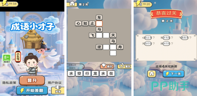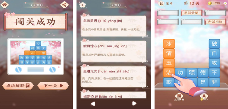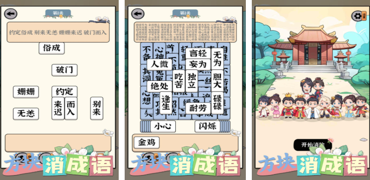 在成语消消闯关游戏中,将成语学习与消除类游戏玩法有机融合,带来轻松有趣的学习体验,游戏的核心玩法是消除,在游戏界面中众多包含成语单字的方块杂乱分布,玩家需要仔细观察,找出能组成成语的相邻方块,选中并进行消除,有的关卡要求玩家在规定步数内消除一定数量的成语方块,有的则需要玩家在限定时间内完成特定成语的消除任务。