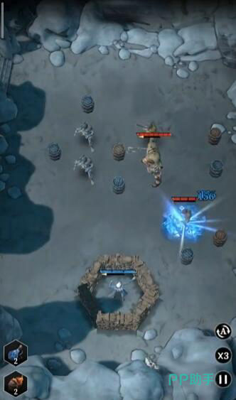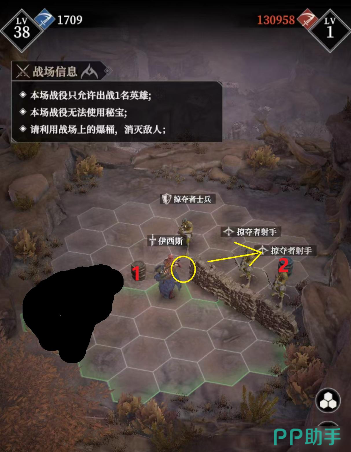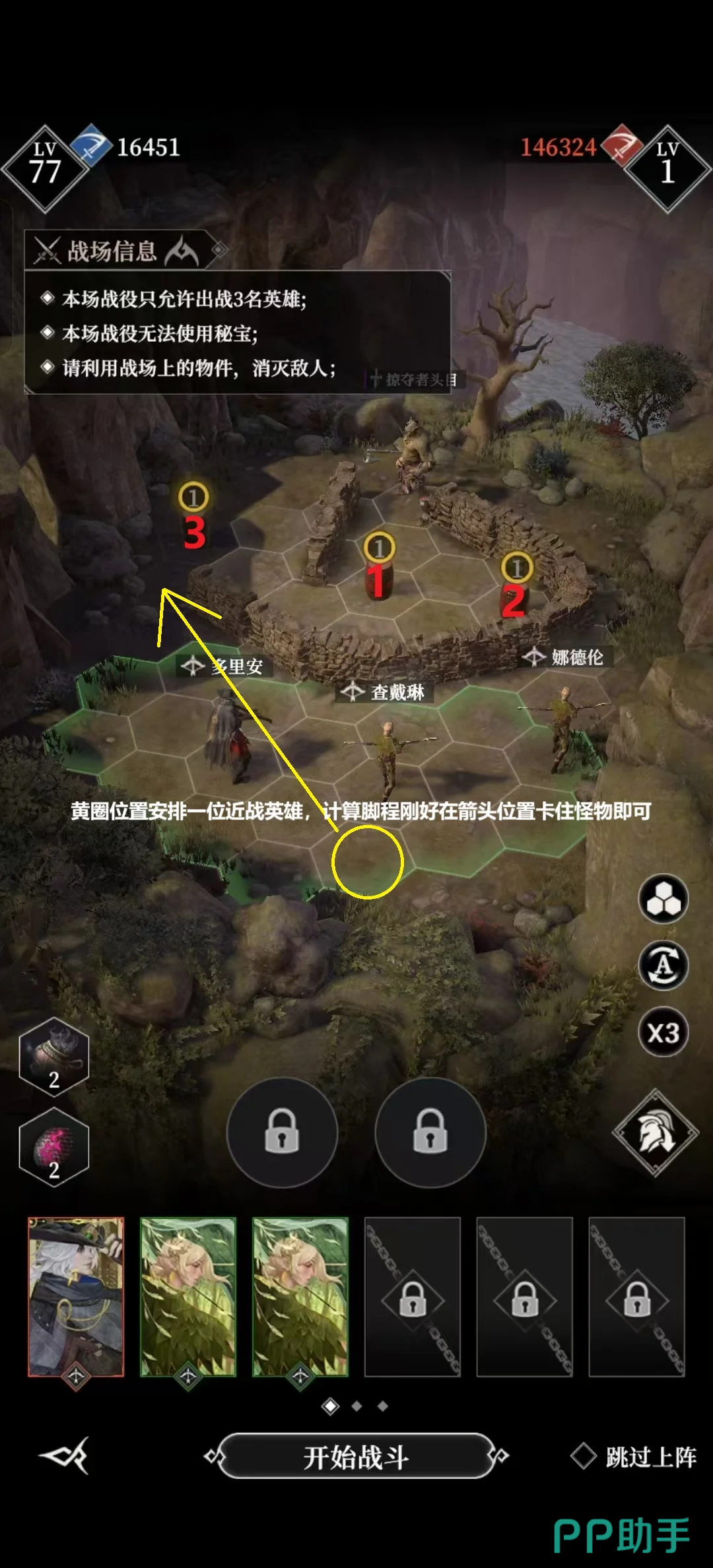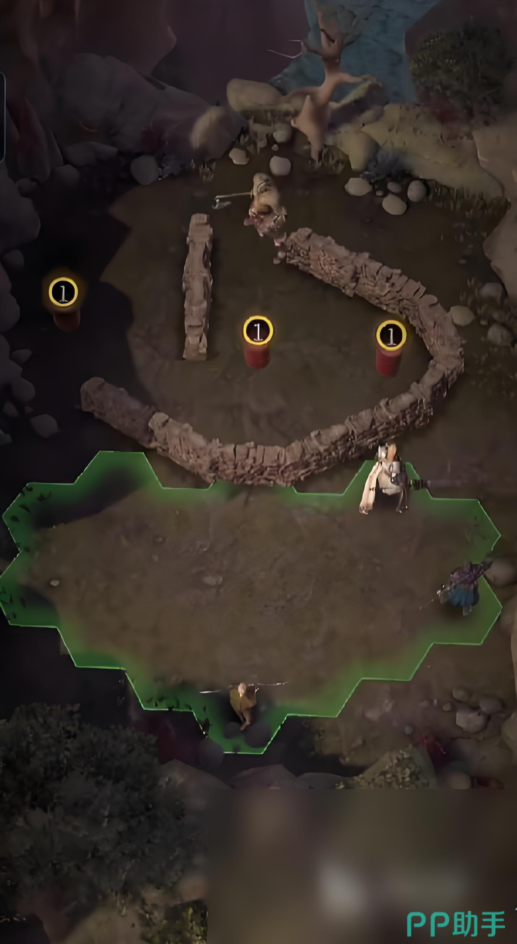 玩家在进入战斗前,可先派侦察英雄到前去探路,然后开始布局,远距离攻击的英雄就站在左侧边上的制高点,近距离攻击的英雄站在右侧隘口。玩家在开战之前,要先把中间的图腾柱子或者是火药桶催毁掉,避免触发雷电陷阱,造成严重损失。