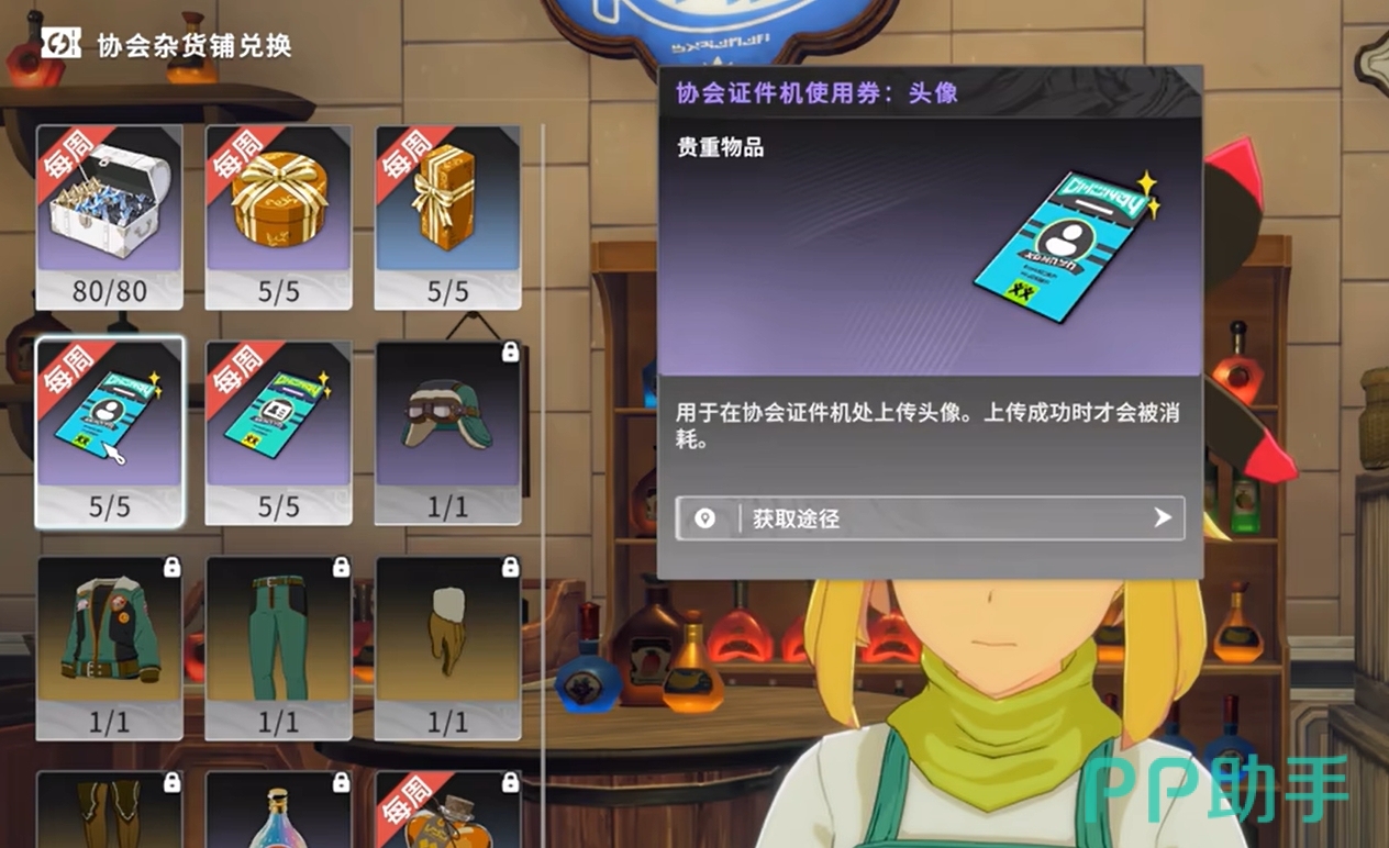 此外,每次进行头像的修改,各位还需要消耗一张”协会证件机使用卷:头像“,该道具只会在玩家所上传的头像完成审核后才会消耗,没审核完成或审核没通过时,不会消耗该道具的数量,且只有使用了该道具后,各位才能完成头像的更新。该道具可在协会找杂货铺管理员奇因进行兑换,每次兑换会消耗200协会货币,每周的兑换上限为5次,且不会累积到下一周,没有特殊需求的玩家可不用囤积,什么时候需要用到它时再来找奇因进行兑换就行,货币不足时可通过接取协会任务或参与协会的活动来获取。