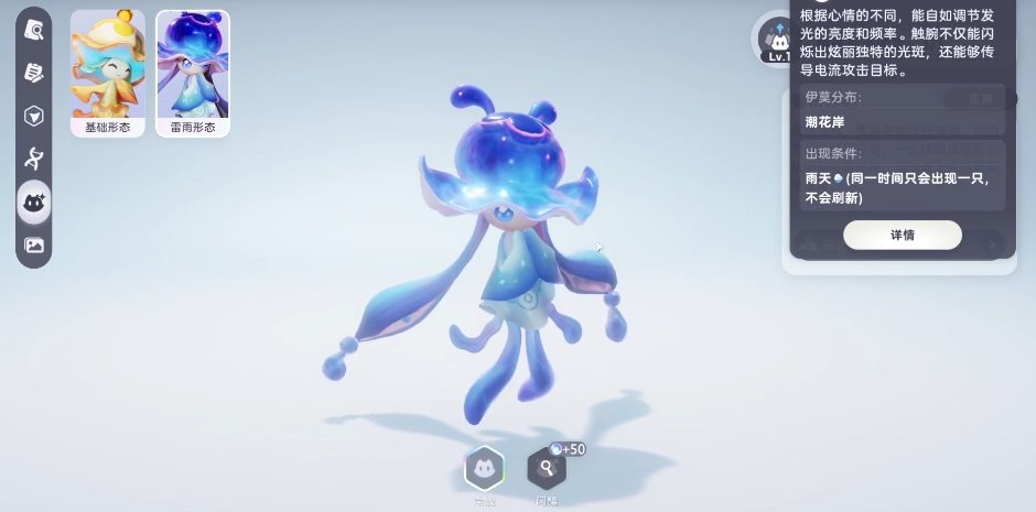 吊灯水母:属性为电,它会根据自己的心情好坏,调节自己身上发光的频率和亮度,长长的触腕可不仅仅是用来展现美丽的,不仅能散发出绚丽多彩的光芒,吸引周围生物的目光,还能在关键时刻传递出强大的电流,对对手发起攻击,不过要是想抓到这神秘的吊灯水母,还得完成一系列的任务,需要先接取吊灯水母boss任务,然后在特定的场地里,等到流星坠落之后,迅速赶到坠落点,在那里大家就可以看到吊灯水母了。