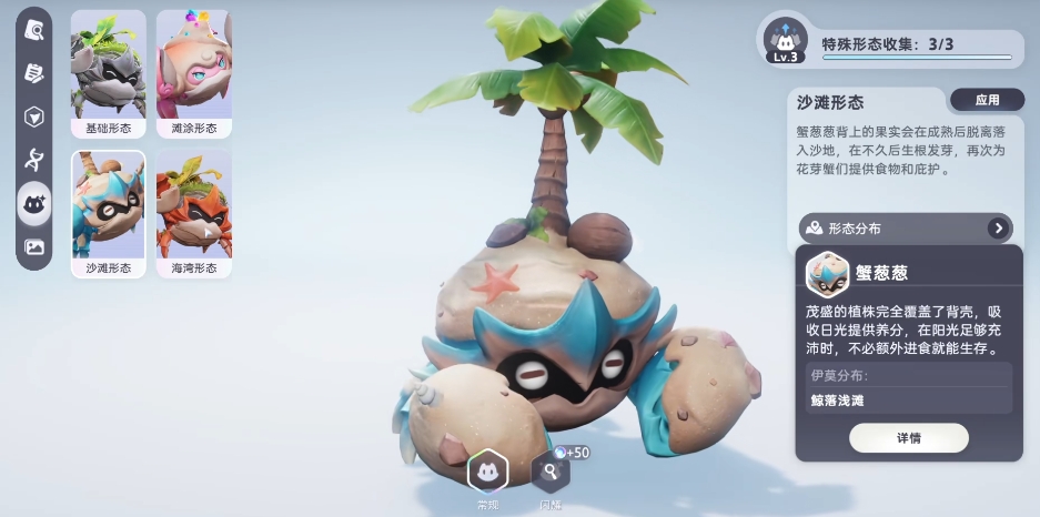 蟹葱葱:属性为土,它的贝壳上可是长满了茂密的植物,就像一个小小的移动花园,这些植物在阳光的照耀下,进行着奇妙的光合作用,使得蟹葱葱只要吸收充足的阳光,就能给自己提供一定的养分,哪怕在没有食物的情况下,它也可以靠着阳光顽强地生存下去。