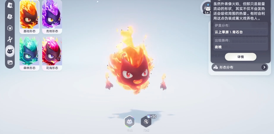 幽幽焰:它的属性为火,可以迅速地吸收掉周围所有的热量,这小家伙还特别爱搞恶作剧,一到夜晚,它就会悄无声息地跟在其他生物的身后,时不时地制造出一些吓人的小动静,看着其他生物被吓得惊慌失措的样子,它似乎就能获得无尽的乐趣,它的栖息之地是在那如梦如幻的云上草原,那里仿若仙境一般,,而幽幽焰就可以在这里捕捉到。