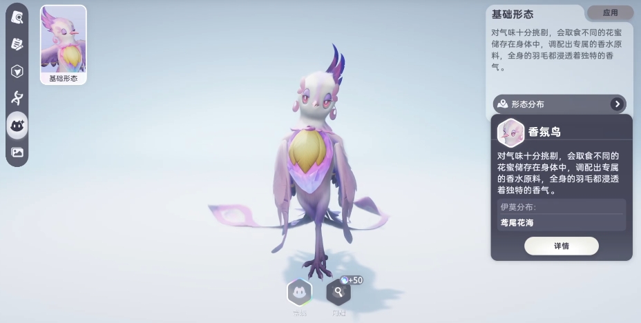 香氛鸟:属性为暗,它是采蜜鸟的进化形态,香氛鸟对于气味那是相当的挑剔,普通的花蜜根本入不了它的法眼,它会穿梭于各种繁花丛中,精心地挑选不同种类的花蜜,然后用自己独特的方式,将这些花蜜调配成特别的香水原料,要是想捕捉到这充满神秘气息的香氛鸟呀,玩家可以前往鸢尾花海旁的那片清澈湖泊,然后游过湖泊,来到湖中央那座别具一格的小屋附近,说不定就能发现香氛鸟的踪迹了。