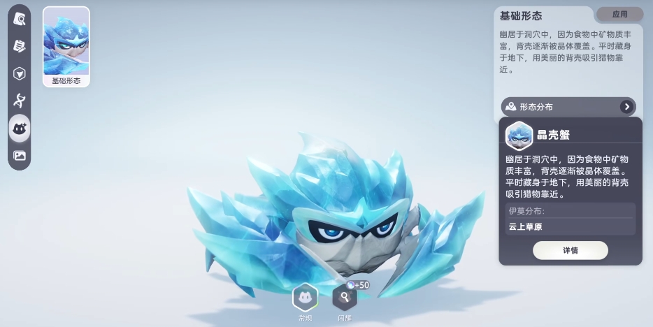 晶壳蟹:属性为冰,它其实是蟹葱葱的进化形态,晶壳蟹总是喜欢居住在幽深宁静的洞穴里面,那里光线昏暗,它的贝壳因为所食用的食物中富含各种各样的矿物质,在这些矿物质的滋养下,经过长时间的积累,它的贝壳逐渐被晶体包裹,晶壳蟹平时还会藏在地下,它的分布地同样在云上草原这片神奇的区域,不过要是想抓到它,可得花费一番心思,最好带上一只火属性和体型较小的伊莫,因为晶壳蟹生活地处于洞穴里面,小型宠物更好打。