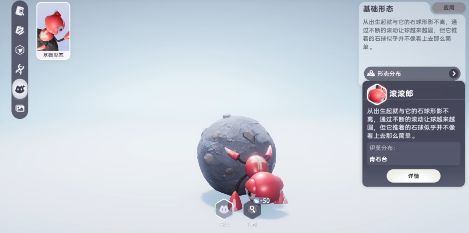 滚滚郎:它属于土属性的伊莫,游戏中仿佛石球就是它生命中最亲密的伙伴,无论走到哪里都形影不离,而它平日里最常做的事情,就是不断地滚动着这个石球,是想抓住这可爱的滚滚朗呀,可得把握好时机,最好把游戏时间调整到夜晚,然后来到青石台的下方,以及凝水成冰地宫的右侧这几个特定的地点,在那里大家可以看到许多正在欢快滚动石球的滚滚朗。