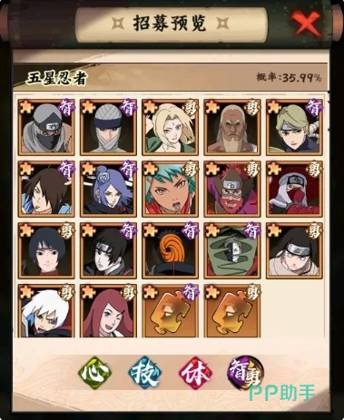 另外在前期的心愿卡池里,一共只有8个SSS+角色,不过随着游戏的不断更新和发展,后期应该会有其他角色陆续加入其中,对于平民玩家而言,有一些SSS角色是非常值得培养的,比如佐助、鸣人、我爱罗、团藏、大蛇丸以及凯等,其中佐助跟团藏更是易伤队里不可或缺的重要角色,他们的技能和属性相互配合,是前期大家比较需要的角色。