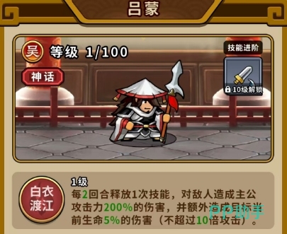 吕蒙:白衣渡江的智者,他的白衣渡江技能每隔2回合便能在战场上触发,对敌人造成主公攻击力 200%的伤害之余,还能洞察敌人的生命弱点,额外造成目标当前生命5%的伤害,且这一额外伤害上限可达10倍攻击。
