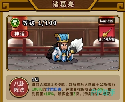 诸葛亮:,他的八卦阵法技能每回合都能对所有敌人造成主公攻击力100%的计策伤害,同时降低目标5%的攻击力,并增加10%的受到伤害,这一效果最多可叠加3次,持续至战斗结束,在战场上布下了一层无形的八卦大阵就可以让敌人在其中逐渐迷失方向,实力被不断削弱。