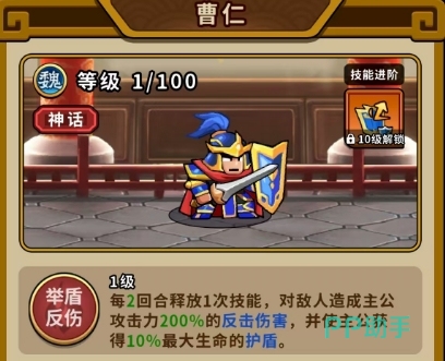 曹仁:其举盾反伤技能每 2 回合便能带来一次防线加注效果,在对敌人造成主公攻击力 200%的反击伤害的同时,为主公披上一层相当于10%最大生命的护盾,可以带来以守为攻的效果,展现出强大的防御与反击能力。
