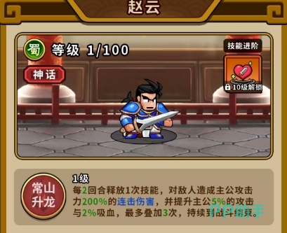 赵云:常山之上的英勇之士,他的常山升龙技能每 2 回合便能释放出来,对敌人造成主公攻击力 200%的连击伤害,同时稳步提升主公5%的攻击与2%吸血能力,这一提升最多可叠加3次,持续至战斗结束,而吸血能力的增强更是让他在战斗中拥有了持久的战斗力。