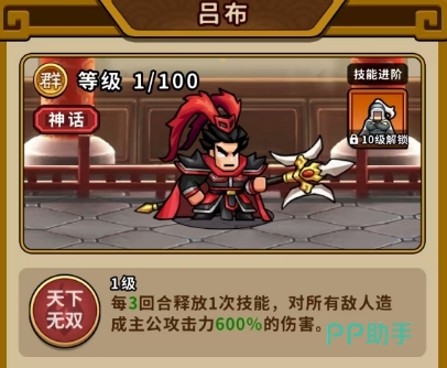 吕布:他的天下无双技能每3回合便能对所有敌人造成主公攻击力600%的惊人伤害,真正做到了一战定乾坤,也是初期大家最需要的一个武将,在自选里面也是比较推荐大家先获取吕布的。