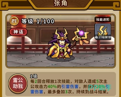 张角:在游戏中是掌控神秘力量的道士,他的雷公助我技能每2回合便能召唤出雷霆,对敌人造成5次主公攻击力40%的引雷伤害,同时提升20%号雷伤害,这一效果最多可叠加3次,持续至战斗结束,强大的雷电之力不仅能够对敌人造成直接伤害,更能让敌军受到连续伤害。