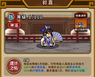 郭嘉:是一位智谋深远且料事如神的谋士,他的遗计之佑技能每回合都可以战斗局势施加着微妙的影响,对所有敌人造成主公攻击力100%的计策伤害,同时为主公提升8%的暴击率与15%的计策伤害,这一效果同样最多可叠加3次,持续至战斗结束,随着战斗的推进,不断地增强主公的战斗能力,让主公的攻击可以更准的打中敌人的要害。