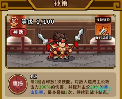 孙策:他的鹰扬技能每2回合便能对敌人造成主公攻击力200%的伤害的同时,大幅提升主公20%的暴击伤害,这一增益最多可叠加3次,让主公的攻击提升,每一次暴击都有更强的输出能力。