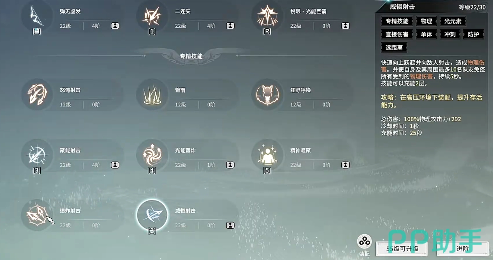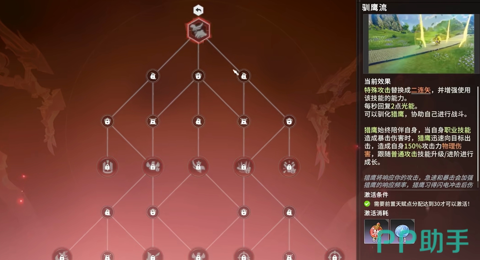 玩家们在解锁了驯鹰流后,就能让自己的神射手成为鹰弓,并且部分技能也会随之被替换,产生与原技能完全不一样的效果。实战中,除了固定技能(二连矢、弹无虚发、大招)外,玩家们可在专精技能中选择聚能射击、光能轰炸、精神凝聚和爆炸射击作为搭配,战斗时以大招为起手技,然后释放精神凝聚,再按照爆炸射击、光能轰炸和聚能射击的顺序来释放技能,最后以二连矢进行收尾,便能顺利地打出一整套爆发,接下来只需用弹无虚发和二连矢为角色积攒光能,等攒好后就能进入下一轮循环继续打爆发了。