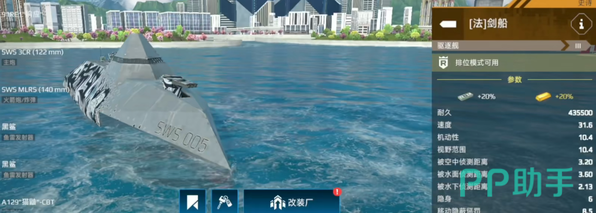 游戏里极具特色的老牌战舰,速度与机动性极佳,隐蔽性能更是在新机制下得到了巨大加强,让它在视野控制与伏击方面具备天然优势。剑船配备了无锁定的防空电磁炮与高抛型锁定火箭弹,虽然在伤害上不算突出(单轮总输出约7.8万),但凭借极强的隐身与机动,能在敌方无法探知的情况下完成击杀。不过剑船也存在明显短板,例如拦截能力弱、防空火力差、血量不高等。其导弹和鱼雷配置要求搭配得当,建议用红旗26等高强度导弹,或者核鱼雷或阿卡丽来提升输出。总体来说,剑船更适合操作熟练、喜欢游击风格的玩家,在风暴地图或广阔海域中表现出色。