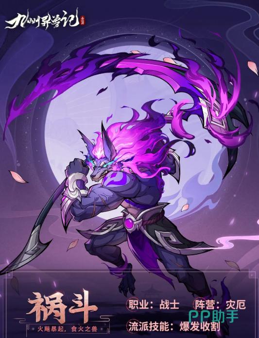 祸斗是一名战士,可以走爆发收割的流派,它的被动能在每回合开始的时候,有30%的概率对随机一名敌方异兽施加灾祸,灾祸会让携带者在回合中受到相当于当前生命20%的伤害,最大不会超过祸斗攻击力的3倍,它的“魔镰掠影”会对前中排的所有敌人造成120%伤害,有24%的几率附加上2回合的易伤害,若目标的职业是战士概率会提升到48%,它的“灾祸之镰”会对敌方生命最低的敌人造成高额伤害,若没有成功击杀掉目标,会附加1回合灾祸。