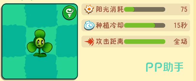 这个植物也是当下的新的植物。这个植物在玩家们通过野营地之后便可以获取到了。从目前的数据来看,这个植物是一个偏辅助类型的植物。它每次种植会消耗75点阳光。辅助的范围则是全场,它本身不可以进行攻击。在种植下去之后可以发动能力,它可以吹走所有的气球僵尸和迷雾,如果和植物进行叠加种植的话则是可以让其进化为风系植物。