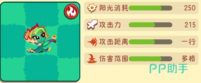 这个便是槲寄生投手的进化植物。这个植物在进化之后所需要阳光数量直接翻倍了。需要250点阳光才可以召唤,这个消耗还是很大的。它的攻击力从原本的100点增加到了215点,这个攻击变强了很多。攻击距离依然是一行,但是变远了一些,伤害的范围也从1格变成了多格。它的能力则是可以投掷出很大的火球砸向僵尸。这个可以对僵尸造成大量的伤害,同时还有着持续的伤害。总体来说虽然它的价格增加了不少,但是本身的能力也增强了很多,玩家们有了它那么麻烦也会减低不少。