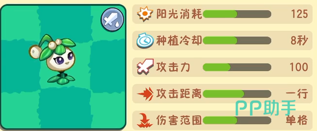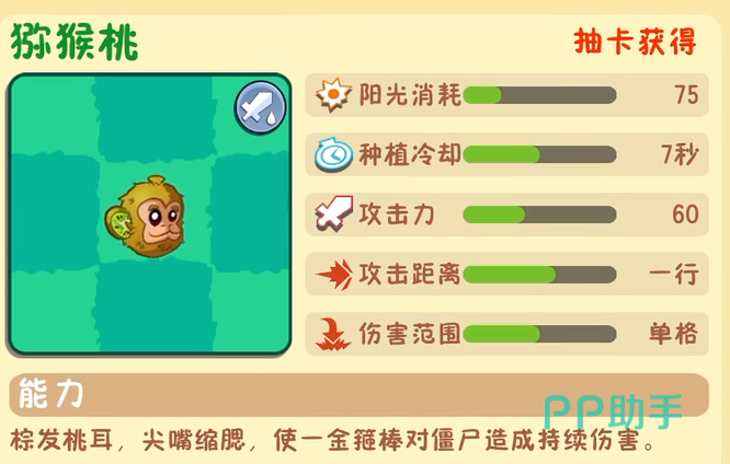 首先在游戏最近的四测之中,关于阳光的数据是有所变动,这点还请玩家们需要注意。这个植物本身需要消耗75点阳光才可以进行召唤,种植冷却则是7秒。其本身的攻击力是60点,攻击距离则是一行,伤害的范围是单格。它主要的特点是可以召唤金箍棒来对僵尸造成持续性的伤害。这个植物是需要我们抽卡才可以获取到,总体来说这个植物的性价比还行,总体的属性也还不错。玩家们如果资源比较多的话还可以对其进行培养进化,进化之后本身的属性和能力都会有所变化和增强。