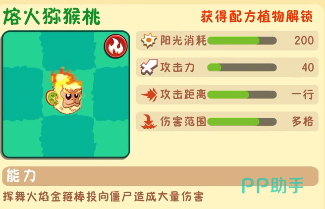这个植物便是上面猕猴桃进化之后的产物,玩家们在获取到配方之后便可以进行进化。这个植物所需要的阳光比较高,需要200点才可以进行召唤。它的攻击力相比于猕猴桃来说降低了不少,它的攻击力只有40。但是它本身的攻击不再是单个的攻击,它可以对多个僵尸造成伤害。本身的攻速也算是比较快的。熔火猕猴桃的能力是可以使用金箍棒对前方的僵尸造成大量的伤害,并且还附带火焰效果。从目前实战来看这个猕猴桃本身的能力还是很强的。但是每次召唤的消耗挺大的。