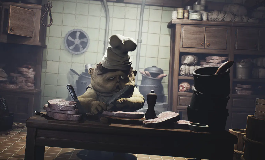 游戏构建了一个暗黑世界,这里的核心场景邮轮像是一座巨大的机械迷宫,有着狭窄的走廊和各种阴暗的角落,每一处都弥漫着位置的危险,再加上整体暗色调的画面、扭曲的建筑结构,能营造出压抑和诡异的氛围,一路上大家遭遇的敌人有头部巨大的厨师、面容扭曲的“长臂怪”等等,这一切都让玩家在探索的过程中时刻保持紧张和未知感。